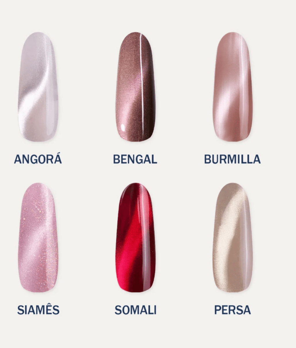 O Cat Eye Bluwe é um esmalte em gel (9 ml) com efeito magnético que vem em um Kit com 6 cores exclusivas: Angorá, Bengal, Burmilla, Persa, Siamês e Somali. Com efeito siliconado e a viscosidade ideal, cada esmalte possui tamanhos e intensidades diferentes de partículas de brilho, que se movimentam em contato com o ímã.